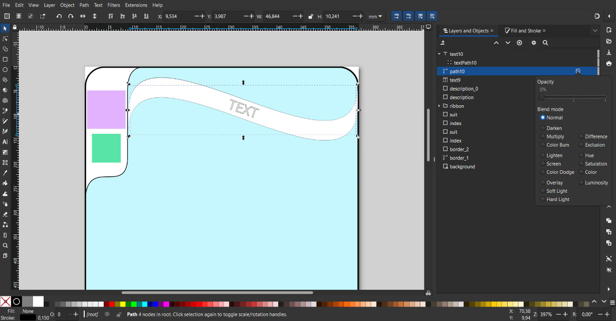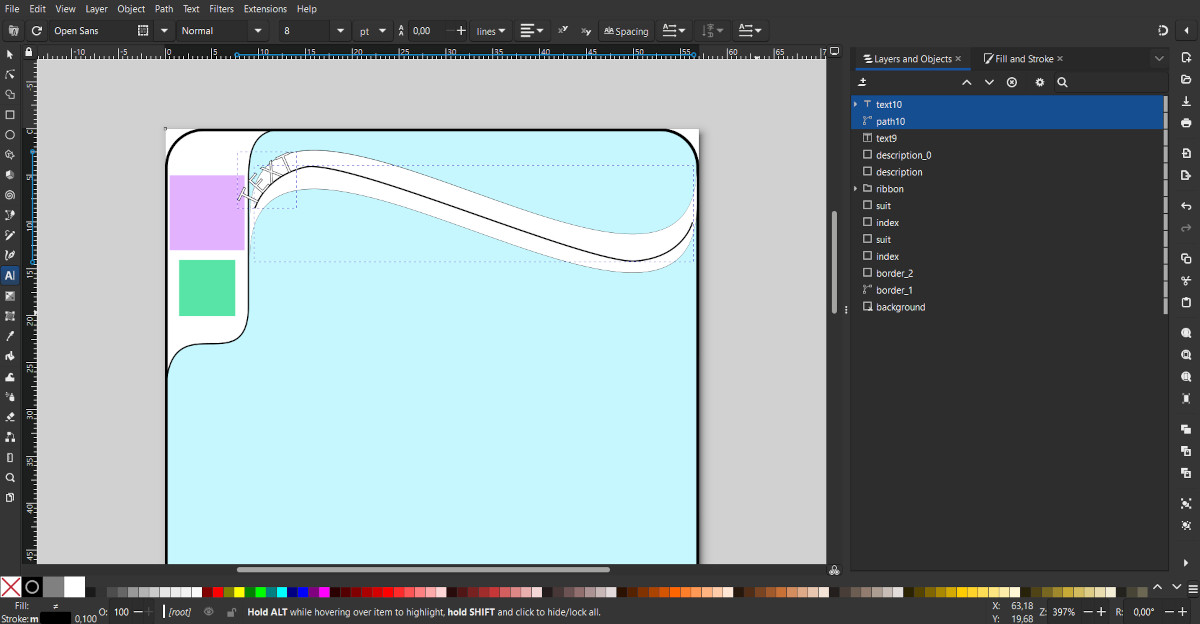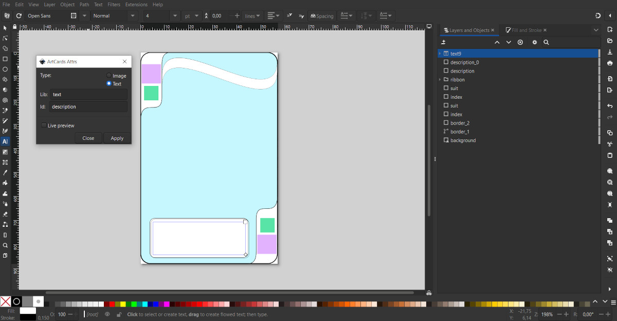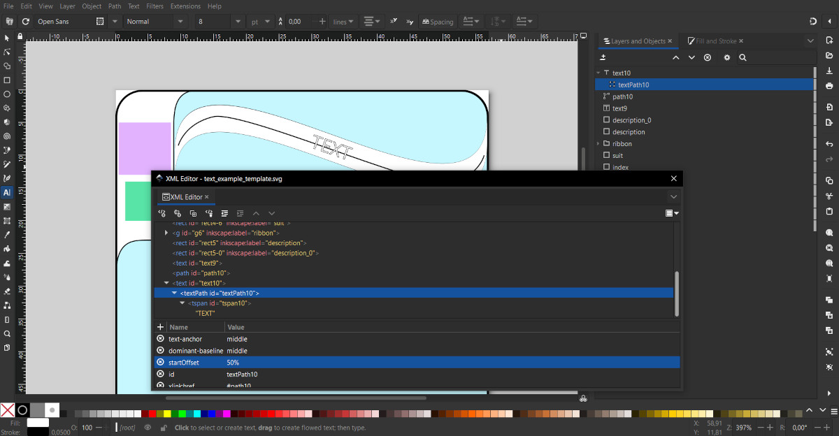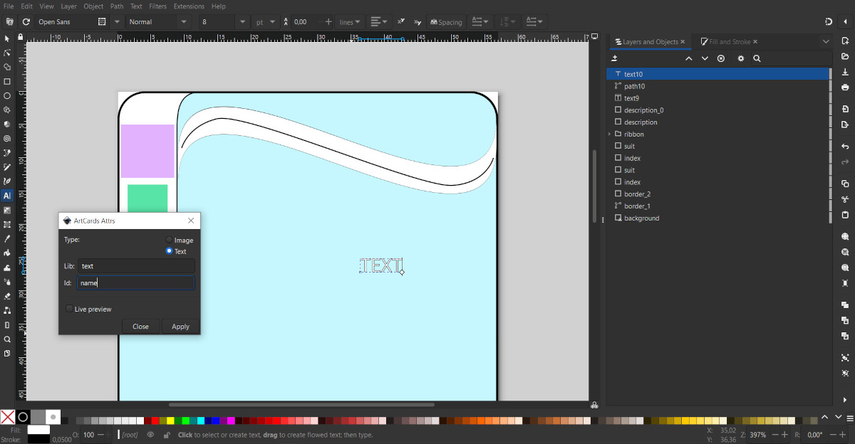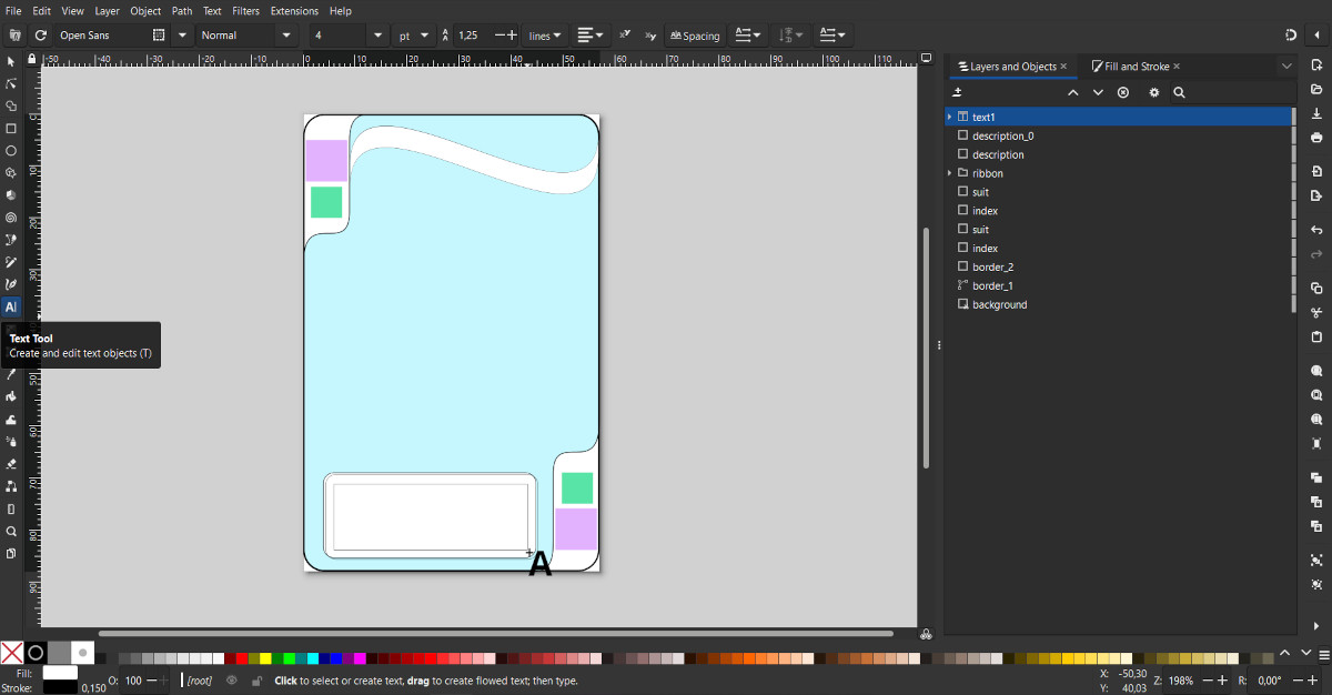 Click anywhere to create a "Text" object. For visual convenience, you can enter arbitrary text. In the main panel, select a font, for example Open Sans, and set the initial font size, for example, 8. Using the "Fill and Stroke" tool, set the color and stroke for the text.